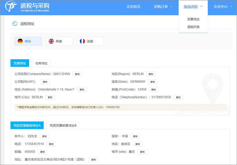 1、目前仅支持英国、德国、法国(即将开通)仓库可以退税;